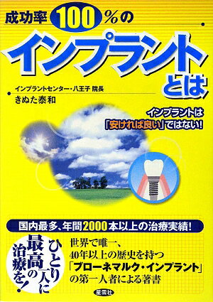 成功率100%のインプラントとは 価格: 1,050円 レビュー評価: 0.0 レビュー数:0 著者:きぬた泰和出版社:ブイツーソリューション/星雲社サイズ:単行本ページ数:138p発行年月:2009年04月この著者の新着メールを登録する【内容情報】(「BOOK」データベースより)世界で唯一、40年以上の歴史を持つ「ブローネマルク・インプラント」の第一人者による著書。【目次】(「BOOK」データベースより)第1章 これだけは知っておきたいインプラント治療の基本(インプラントは天然歯に劣らない「第二の永久歯」/インプラントと入れ歯・ブリッジとの違い ほか)/第2章 事前にチェックしておこう!よい医院選びのポイント(医院選び インプラントは「実績・設備 Supported by 楽天ウェブサービス |